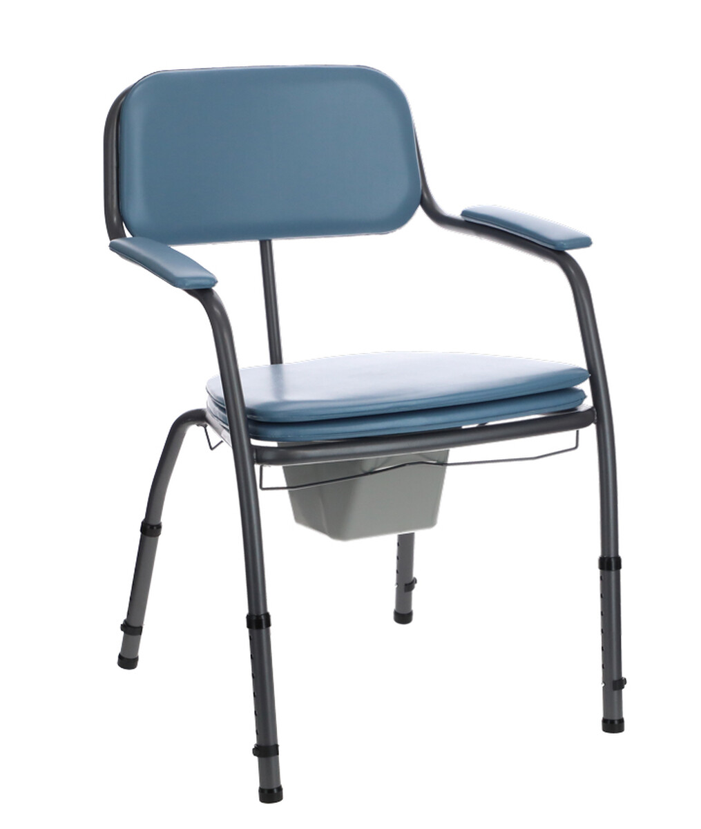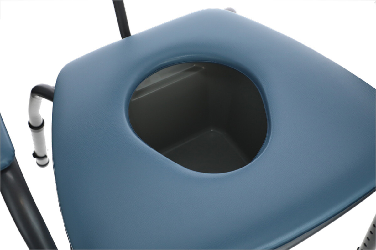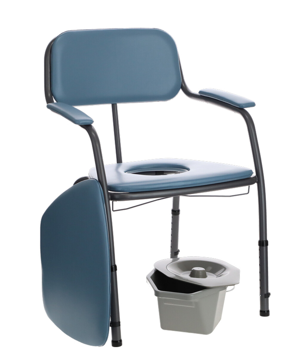 Modrá toaletná stolička so širším sedom slúži ako náhrada WC pre málo mobilných ľudí.