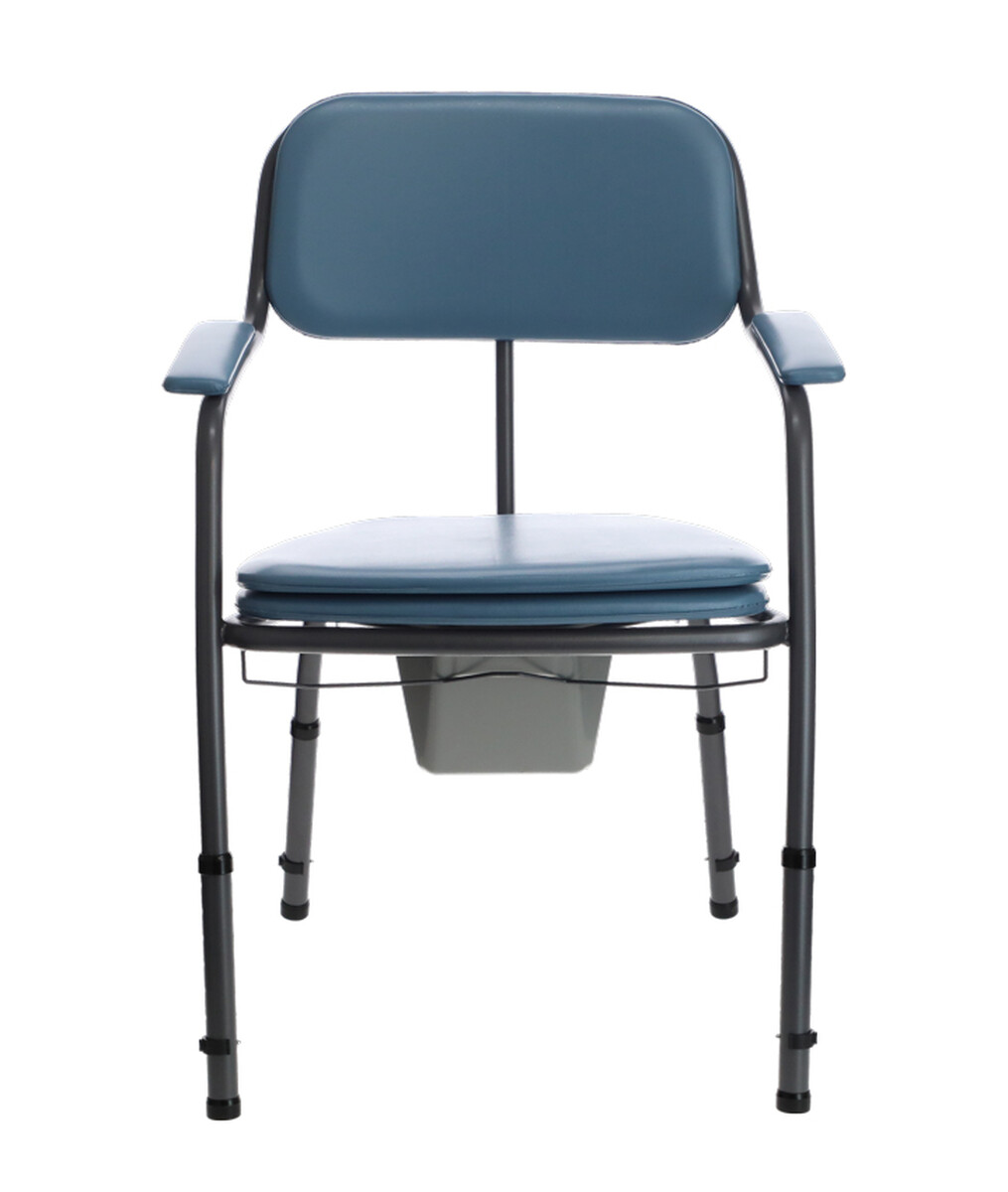 Toaletná stolička so širším sedom s hygienickým výrezom a plastovým vedierkom slúži ako náhrada WC pacientom so zníženou pohyblivosťou.