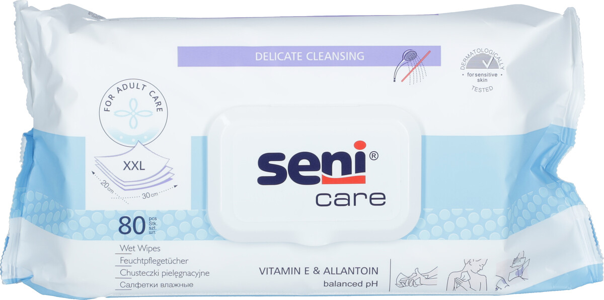 Vlhčené utierky SENI CARE je možné využiť jednoducho doma aj na cestách. Sú určené na špeciálnu starostlivosť o citlivú pokožku. Vlhčené obrúsky obsahujú vitamín E, ktorý má upokojujúce účinky a urýchľuje hojenie rán a alantoín, ktorý upokojuje podráždenú pokožku.
