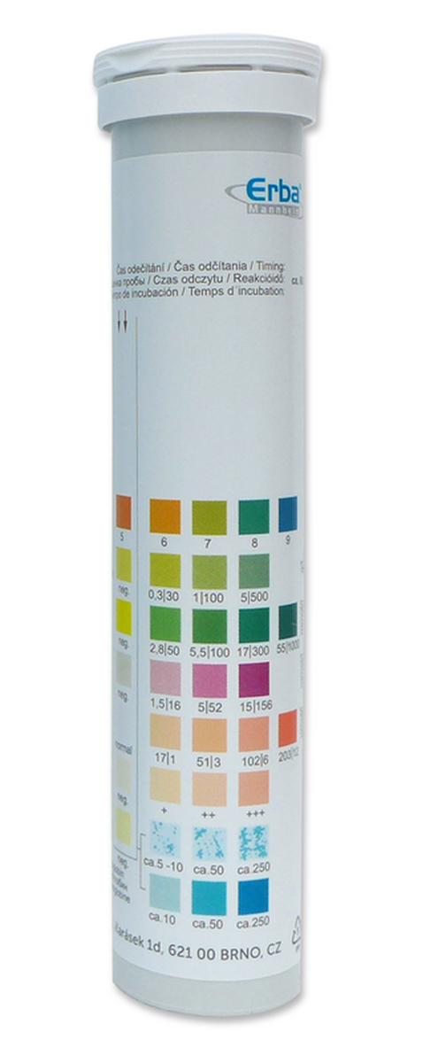 Domáci test na zistenie možnej prítomnosti bielkovín, glukózy, bilirubínu, ketónov alebo urobilinogénu v moči a na stanovenie jeho hodnoty pH.