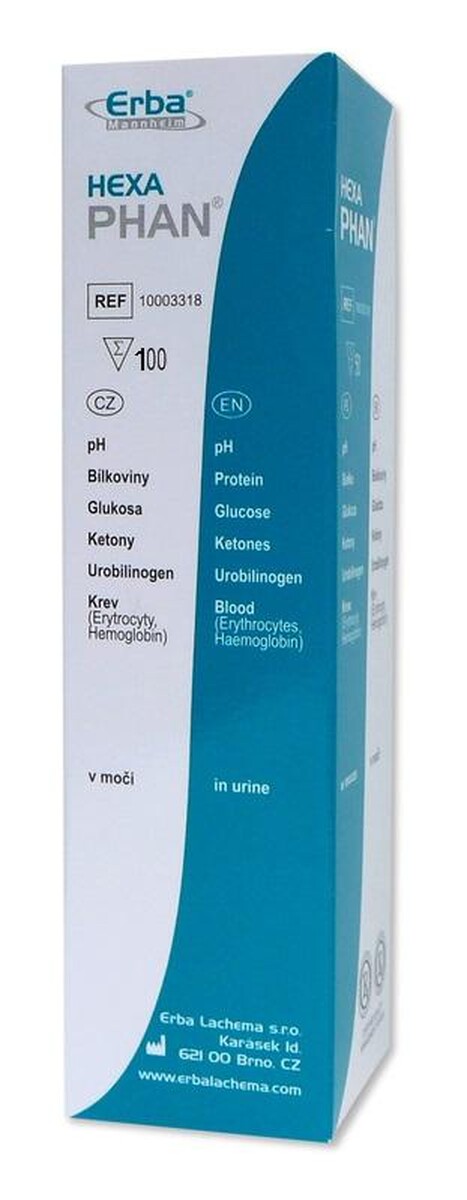 Domáci test Hexaphan na zistenie možnej prítomnosti bielkovín, glukózy, ketónov alebo urobilinogénu v moči a na stanovenie jeho hodnoty pH.