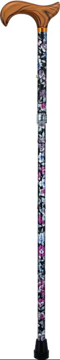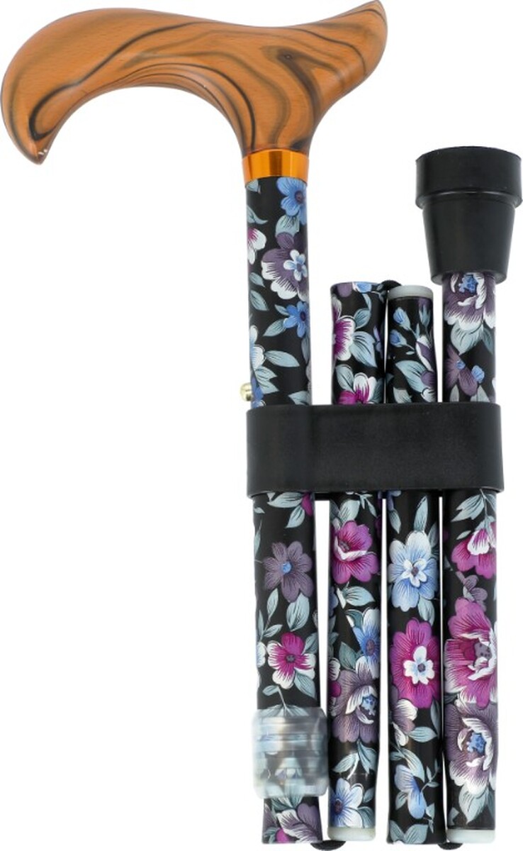 Kvietkovaná skladacia palička s hnedou anatomickou rukoväťou je moderná palička určená na podporu pri chôdzi. Je chránená gumovým zakončením pre bezpečné a bezhlučné používanie.