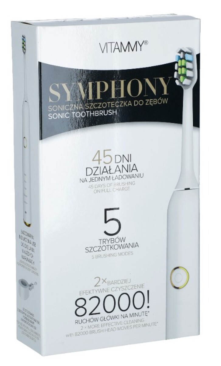 Sonická zubná kefka VITAMMY SYMPHONY White s vysokou vibračnou silou a príjemným bielym dizajnom so zlatými prvkami sa postará o dokonalú ústnu hygienu. Vďaka tvaru hlavy kefky budú zuby vyčistené precízne a zároveň šetrne.
