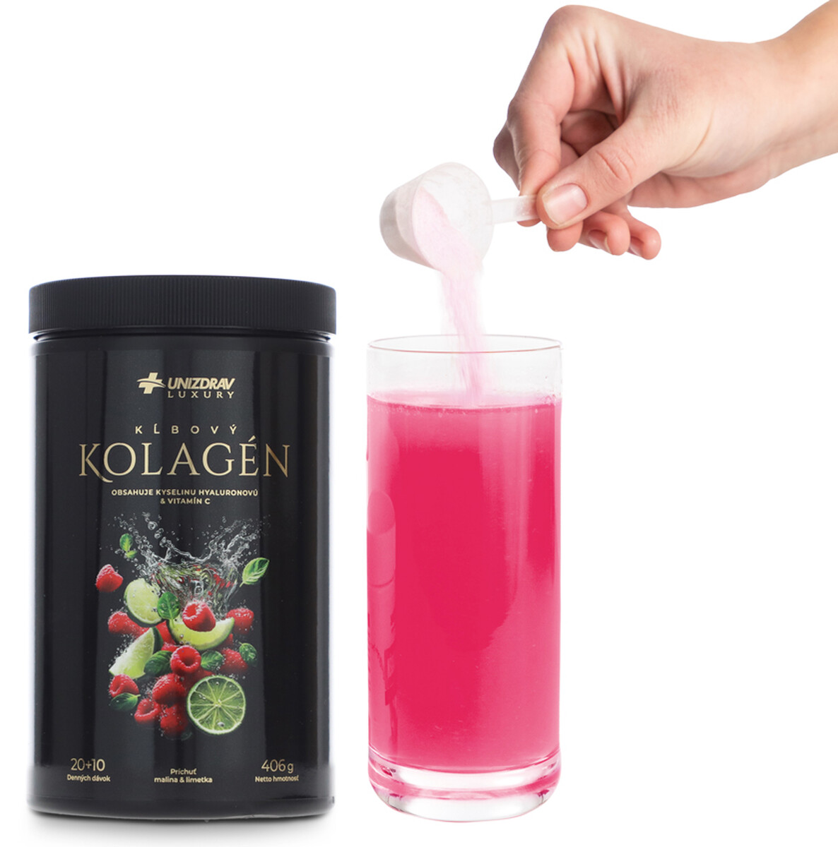 Výživový doplnok v prášku s malinovo-limetkovou príchuťou na prípravu kolagénového nápoja.