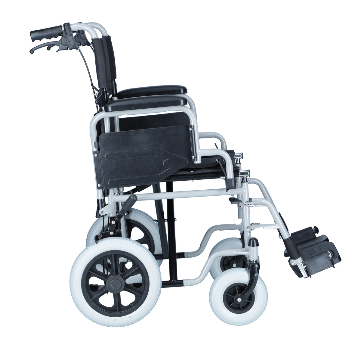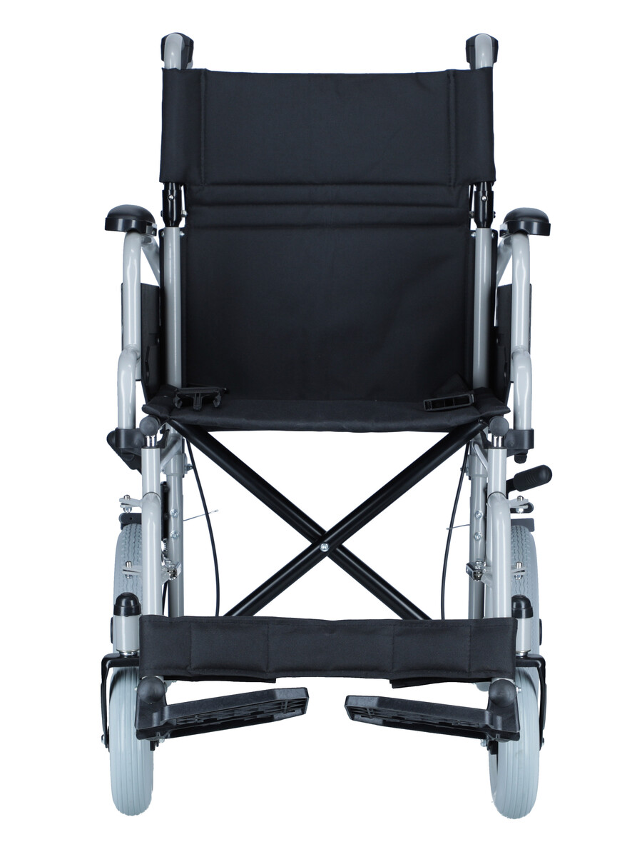 Ľahko prenosný skladací invalidný vozík s pevnou konštrukciou je určený na prevoz pacientov pomocou sprievodnej osoby.