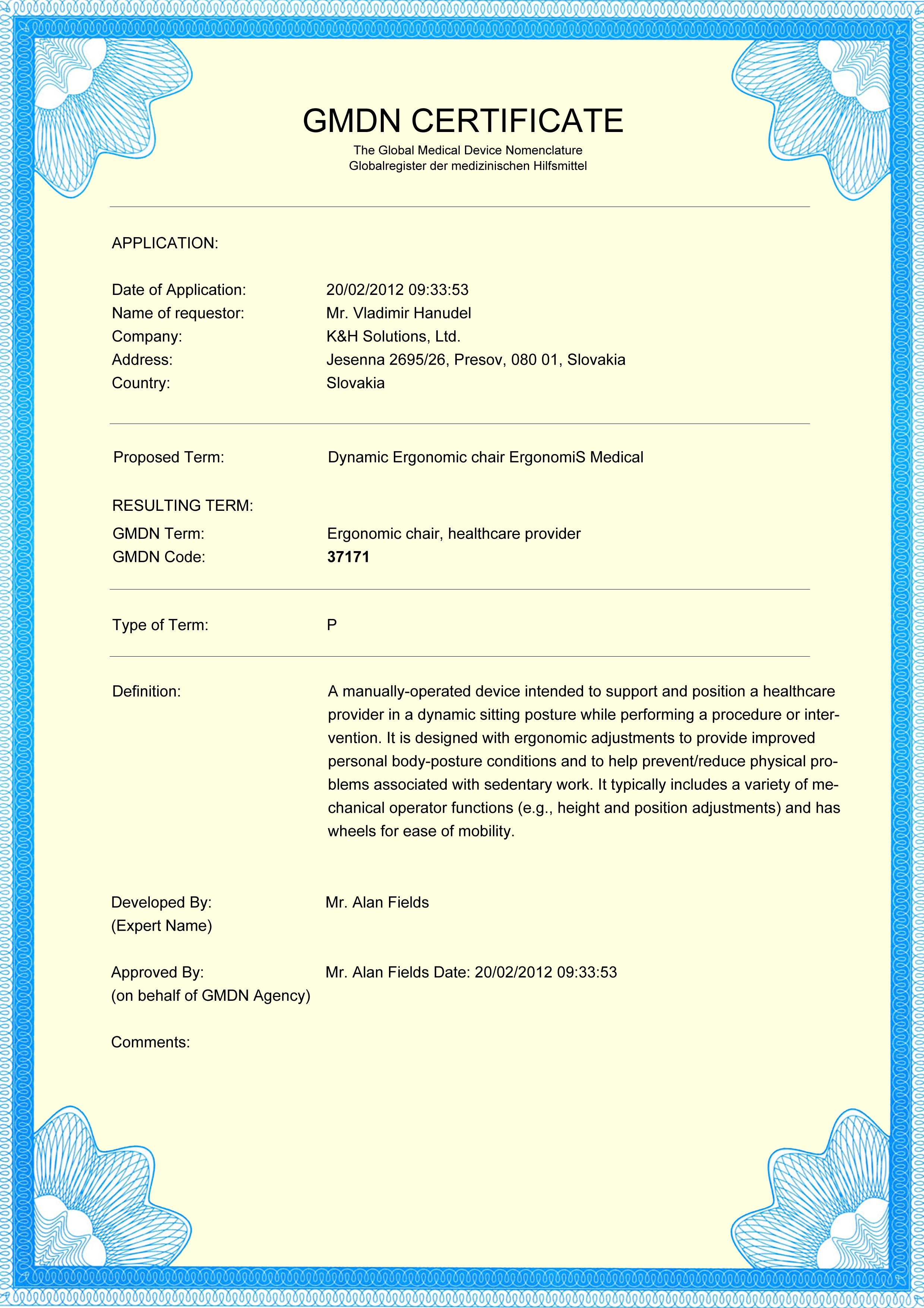 Ergonomická stolička je certifikovaná Globálnou nomenklatúrov zdravotníctva na prevenciu a zníženie fyzických problémov spôsobených dlhším sedením. Stolička podporuje a zlepšuje držanie tela prostredníctvom aktívneho sedenia. Stolička je v súlade s normami ISO 9001:2008 a ISO 9001:2000.