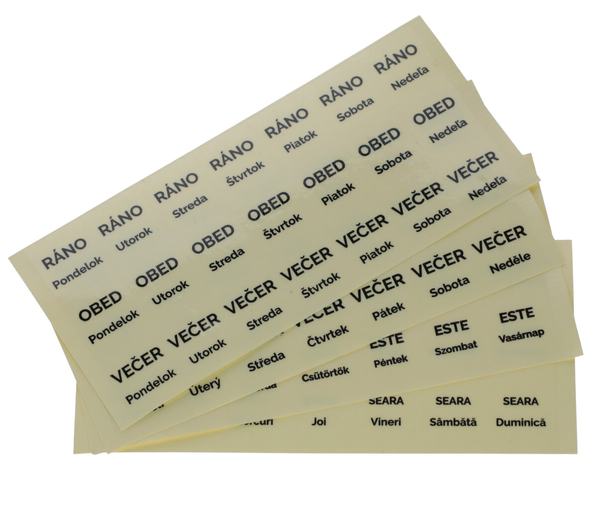 Dávkovač liekov UNIZDRAV je dodávaný spolu s priehľadnými nálepkami v štyroch jazykových mutáciách, a to slovensky, česky, maďarsky a rumunsky, ktoré sa lepia na jednotlivé priehradky.