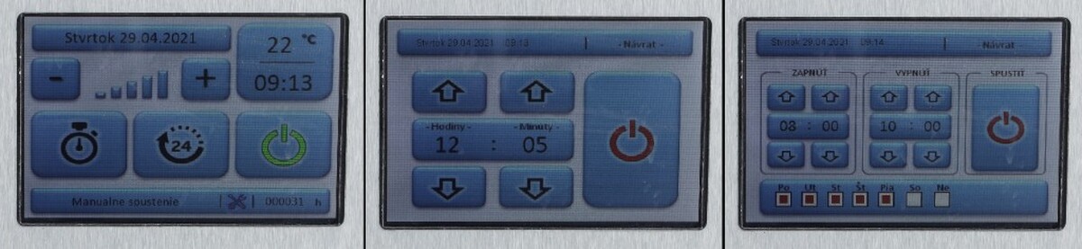 Prehľadný displej umožňuje používateľovi nastaviť si vlastný čas prevádzky zariadenia, automatický štart, intenzitu ventilátora, ako aj dátum a jas obrazovky. Infražiarič je navyše vybavený farebným podsvietením, ktoré indikuje stav prevádzky – zelená farba pri zapínaní, modrá počas prevádzky, červená pri výskyte technického problému.