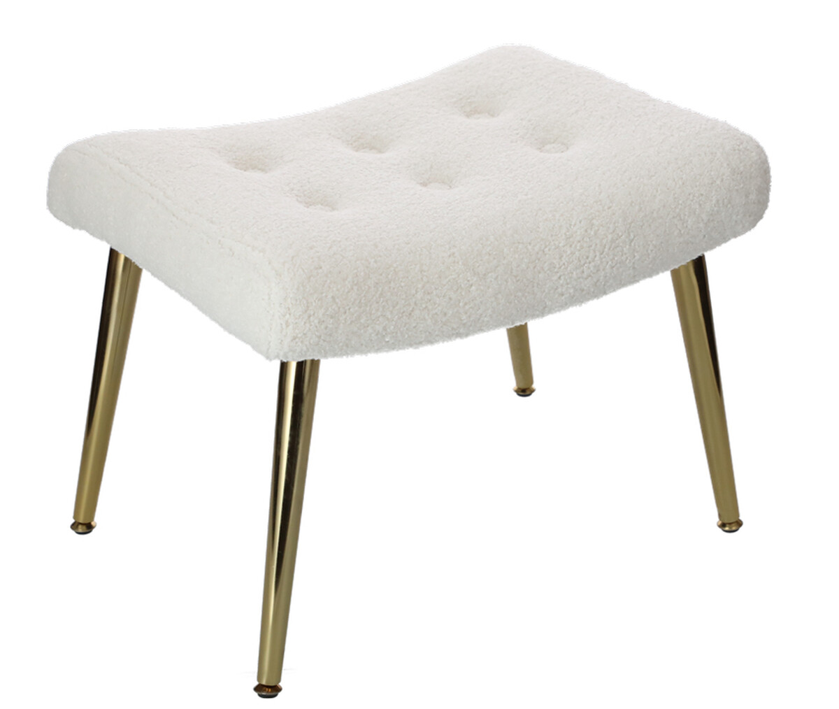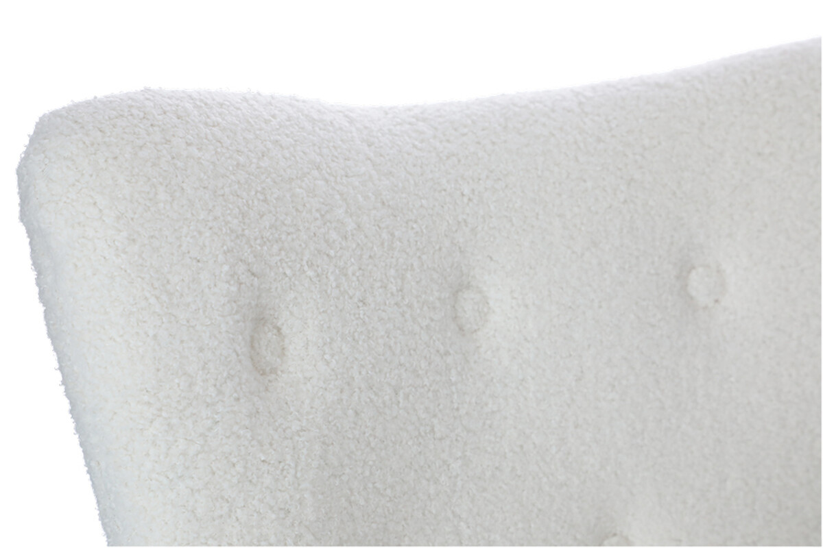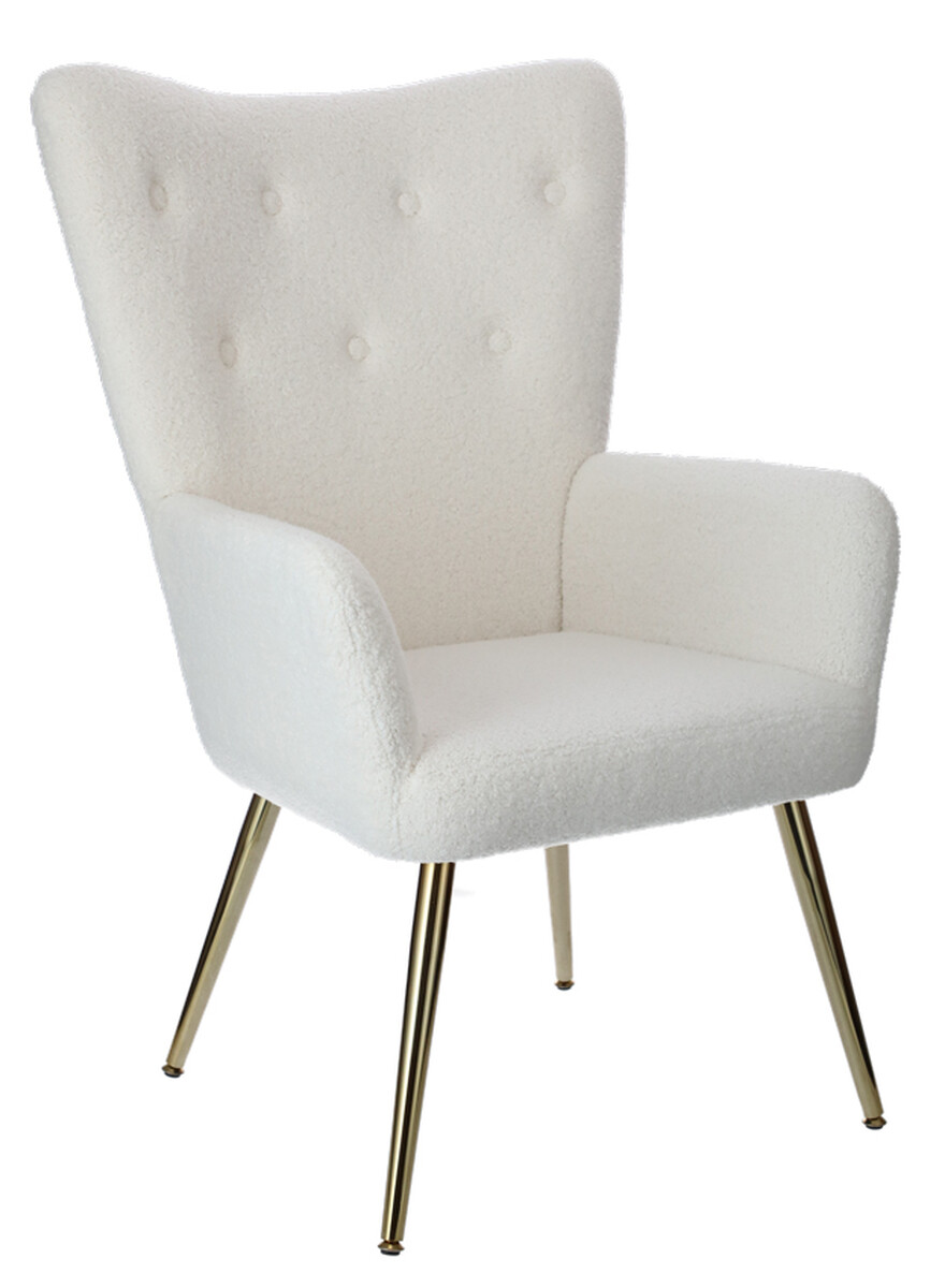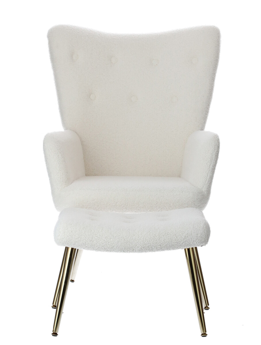Doplňte svoj interiér atraktívnym relaxačným kreslom s podnožkou, ktoré bolo dizajnované do moderného elegantného štýlu. Spracovanie s poťahom z hebkého materiálu buklé v bielej farbe je dokombinované štíhlymi zlatými nožičkami, ktoré odľahčujú celkový vzhľad kresla.