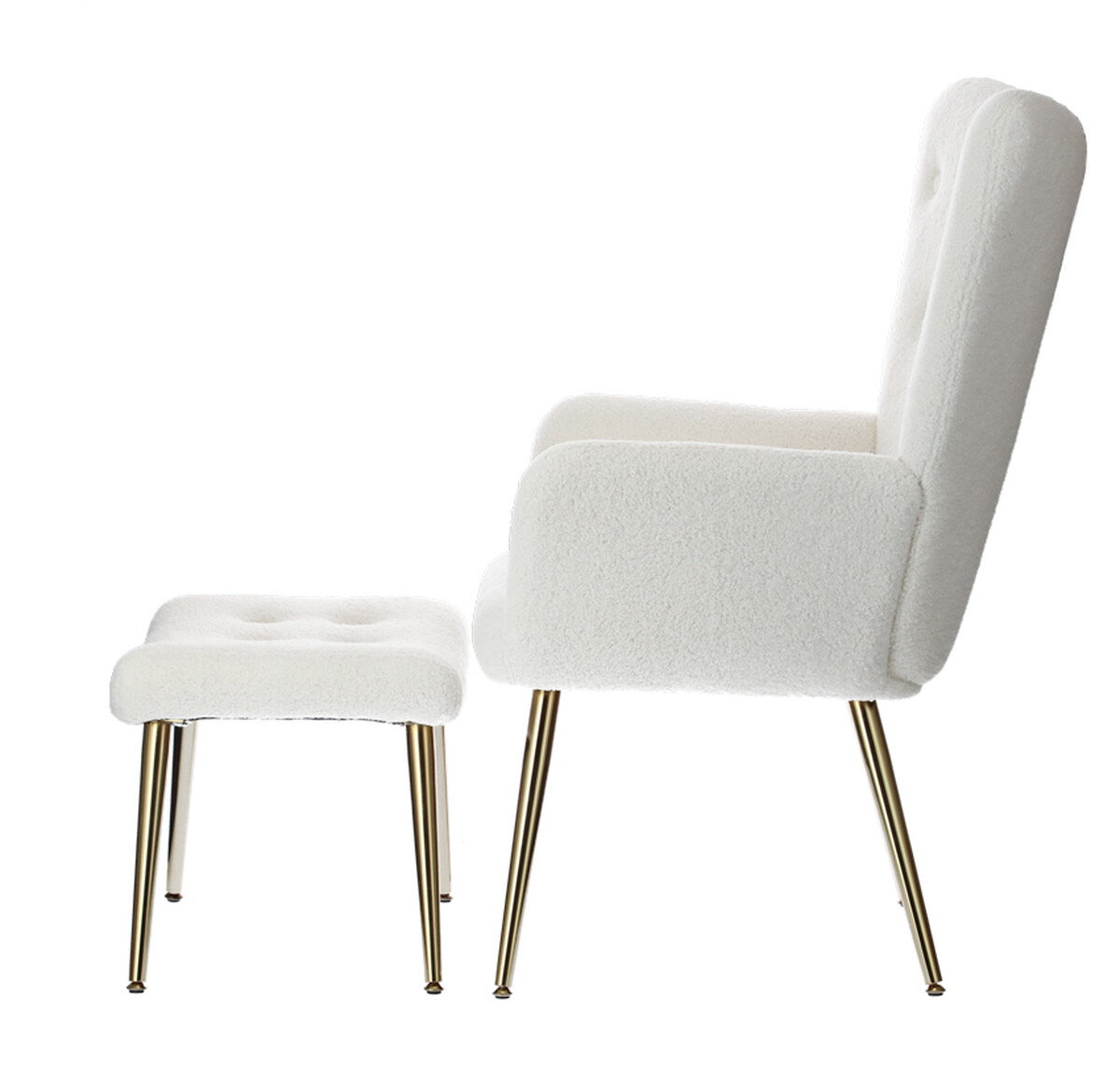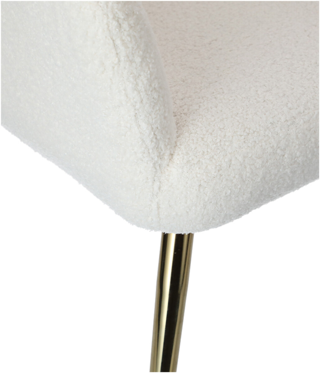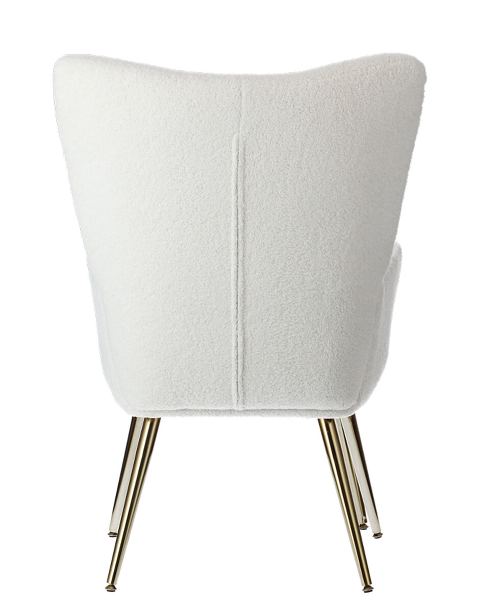 Doplňte svoj interiér atraktívnym relaxačným kreslom s podnožkou, ktoré bolo dizajnované do moderného elegantného štýlu. Spracovanie s poťahom z hebkého materiálu buklé v bielej farbe je dokombinované štíhlymi zlatými nožičkami, ktoré odľahčujú celkový vzhľad kresla.