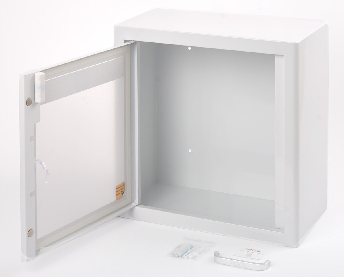 AED skrinka má plastovo-kovový obal potiahnutý odolnou práškovou farbou a priehľadné sklo. Rozmery 38 x 38 x 20 cm ponúkajú dostatočne veľký priestor na bezpečné uloženie defibrilátora.