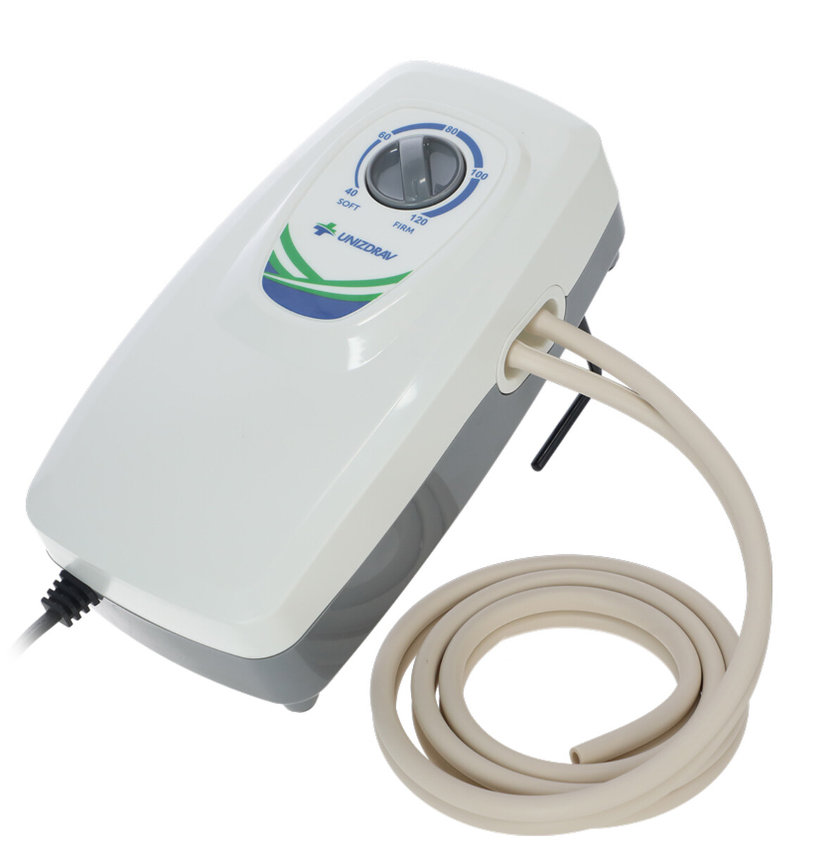Kompresor má nízku prevádzkovú hlučnosť a pacientov neruší. Na zadnej strane má dva zapustené háky, s ktorými sa dá zavesiť na konštrukciu postele, kde bude bezpečne po ruke.