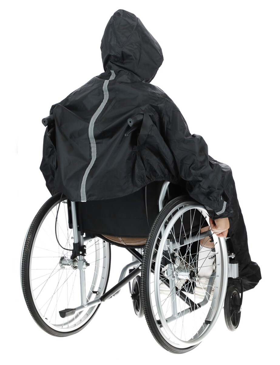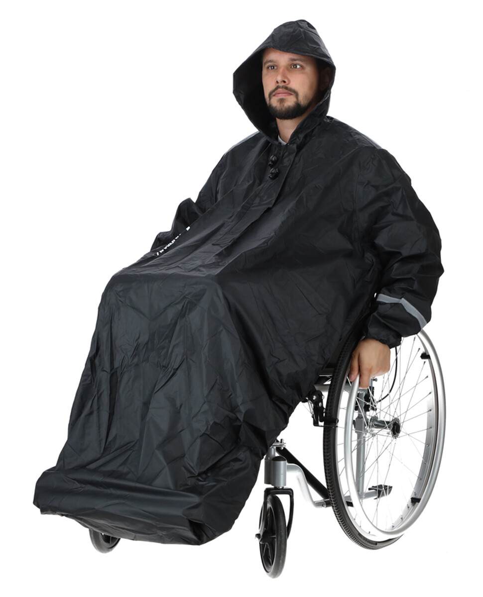 Nepremokavý pršiplášť s rukávmi a kapucňou, špeciálne navrhnutý ako užitočný doplnok k invalidným vozíkom.