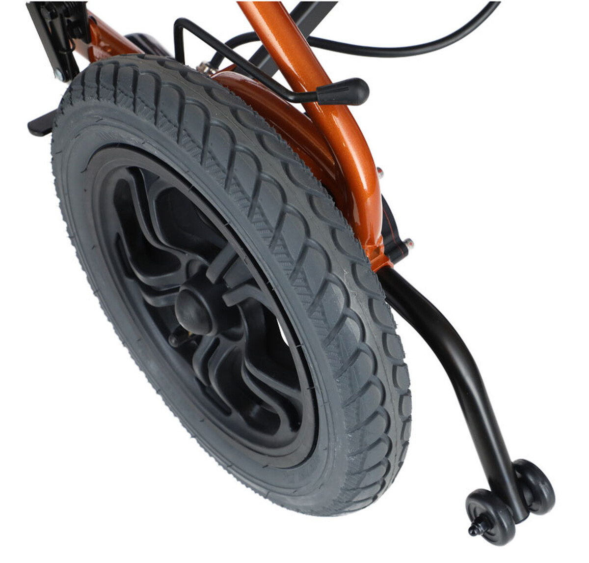 O bezpečnosť počas presunov sa stará elektromagnetická brzda, ktorá počas zastavenia poskytuje spoľahlivý brzdný účinok. Okrem toho nechýbajú ani manuálne prítlačné brzdy, kolieska proti prevráteniu, nastaviteľný bezpečnostný pás s upínaním cez brucho a klaksón. Stabilitu na rôznych typoch povrchov v interiéri aj exteriéri zaručujú pneumatické kolesá.