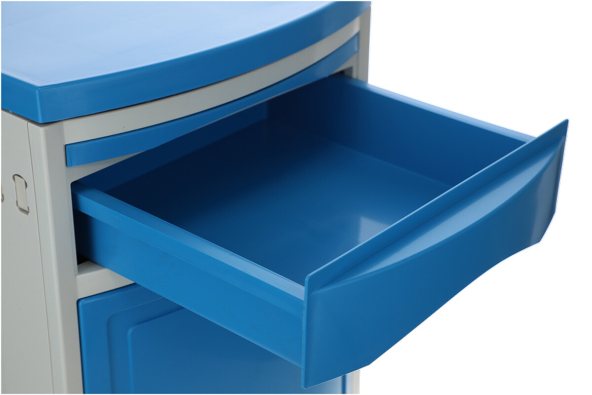 Nemocničný nočný stolík k polohovateľným posteliam ponúka dostatok úložného priestoru. Okrem základnej skrinky a zásuvky je vybavený výsuvnou jedálenskou doskou a praktickými bočnými vešiakmi.