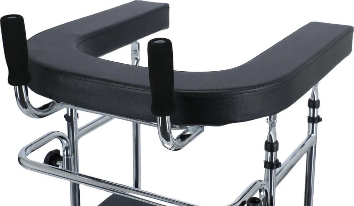 Mobilné chodítko so sedadlom a vystuženým ramenom v tvare U na podporu pri chôdzi.