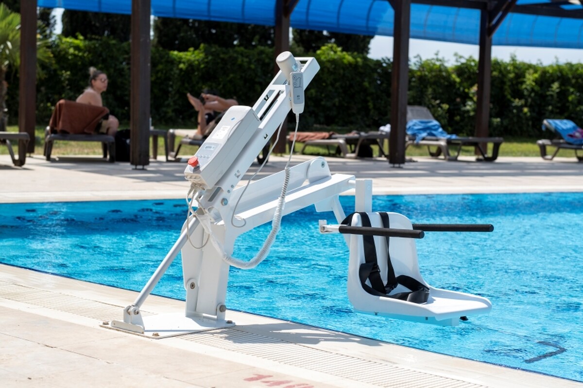 Mokrému a klzkému bazénovému prostrediu sú prispôsobené aj všetky ďalšie komponenty zariadenia. Stabilitu pri používaní zaisťuje bezpečnostný pás, opierky rúk a nôh a tiež systém núdzového režimu v prípade nečakanej situácie.