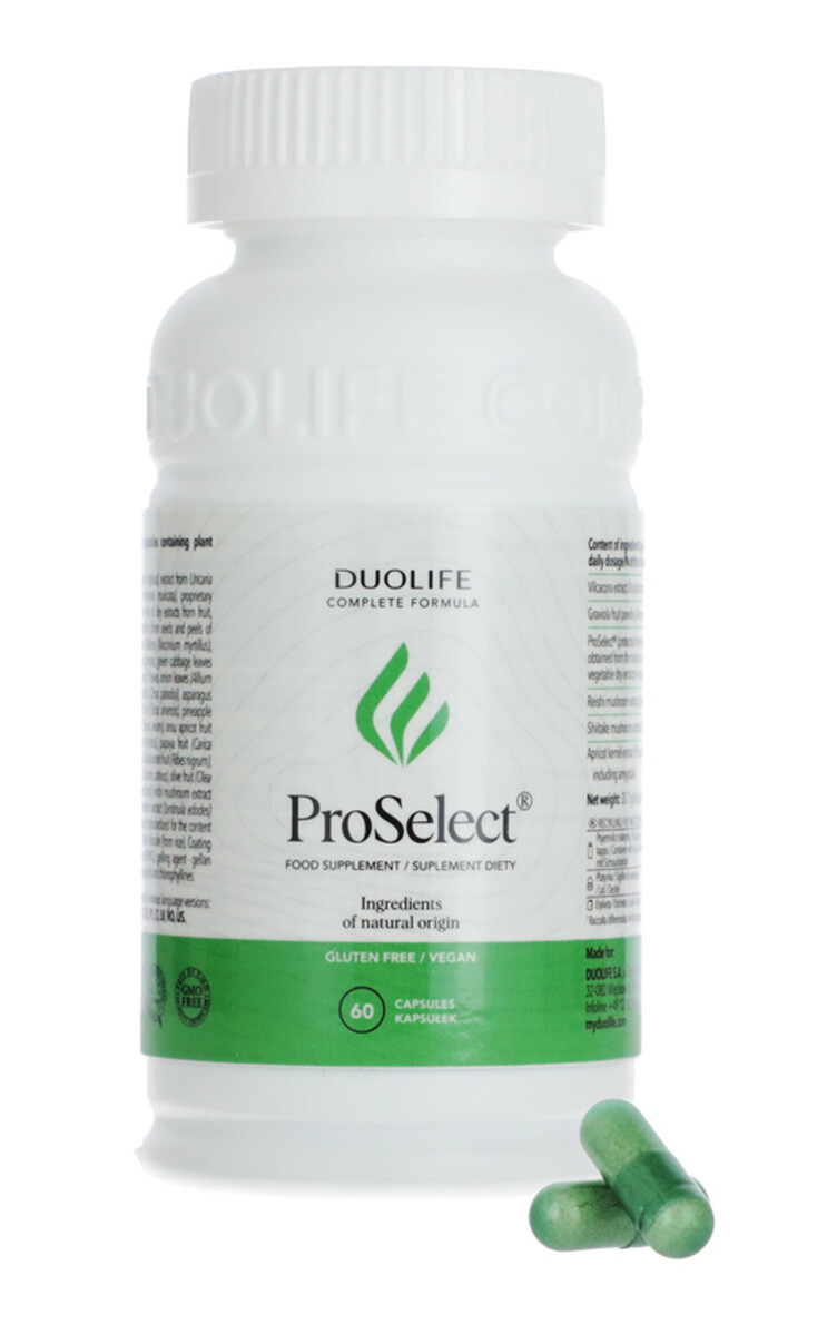 Doplnok stravy ProSelect kombinuje tradičné bylinné znalosti s modernou vedou. Neobsahuje žiadne umelé konzervačné látky, umelé plnivá ani GMO. Forma kapsúl s oneskoreným uvoľňovaním zaisťuje postupné vstrebávanie aktívnych látok a nezaťažuje trávenie. DUOLIFE ProSelect je zaradený do Kolínskeho zoznamu (Cologne List®) – zoznamu výrobkov s minimalizovaným rizikom dopingu.